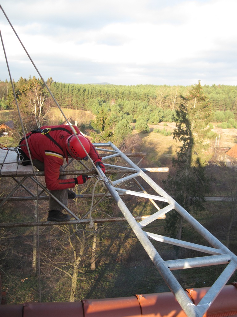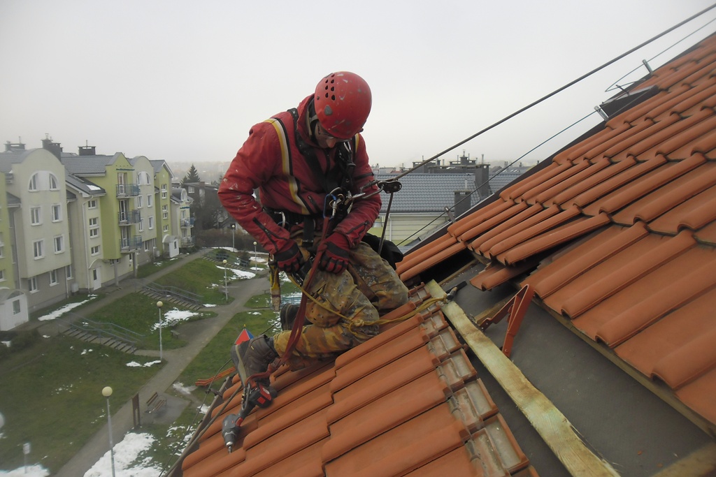 Montaż rusztowania na okalającego wieżę zabytkowego kościoła |